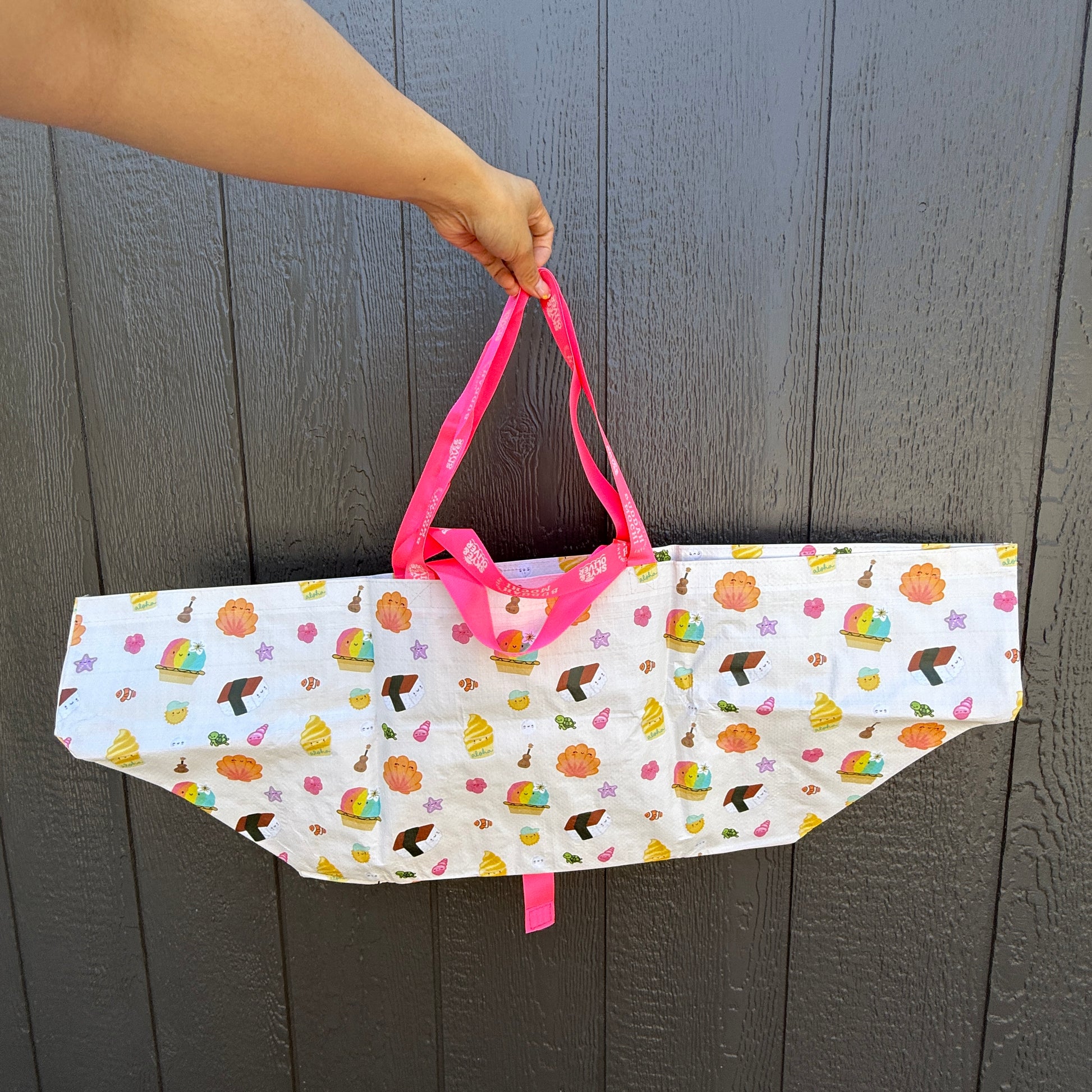 The only and only Bombucha bag with a tropical design and dual neon pink handles! Made from polypropylene woven fabric which makes it durable and easy to clean.