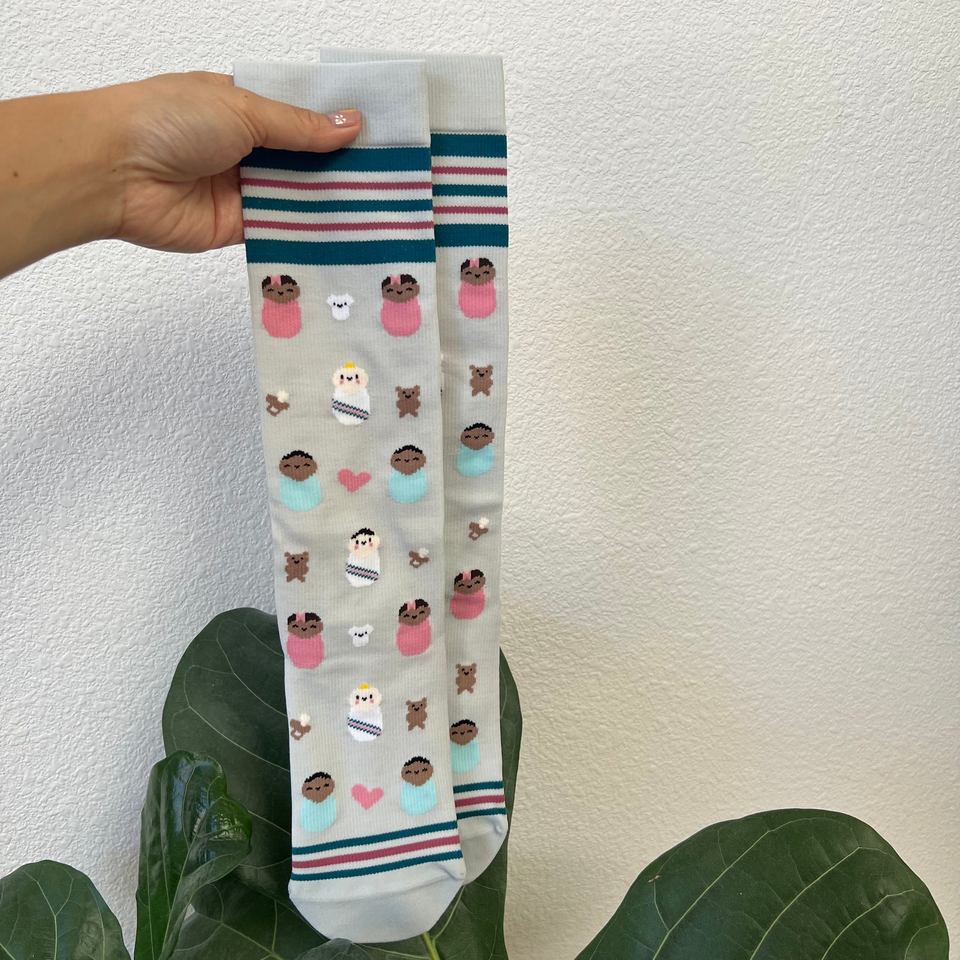 The cutest compression sock collab ever! Baby blanket theme with cute babies and baby items throughout!