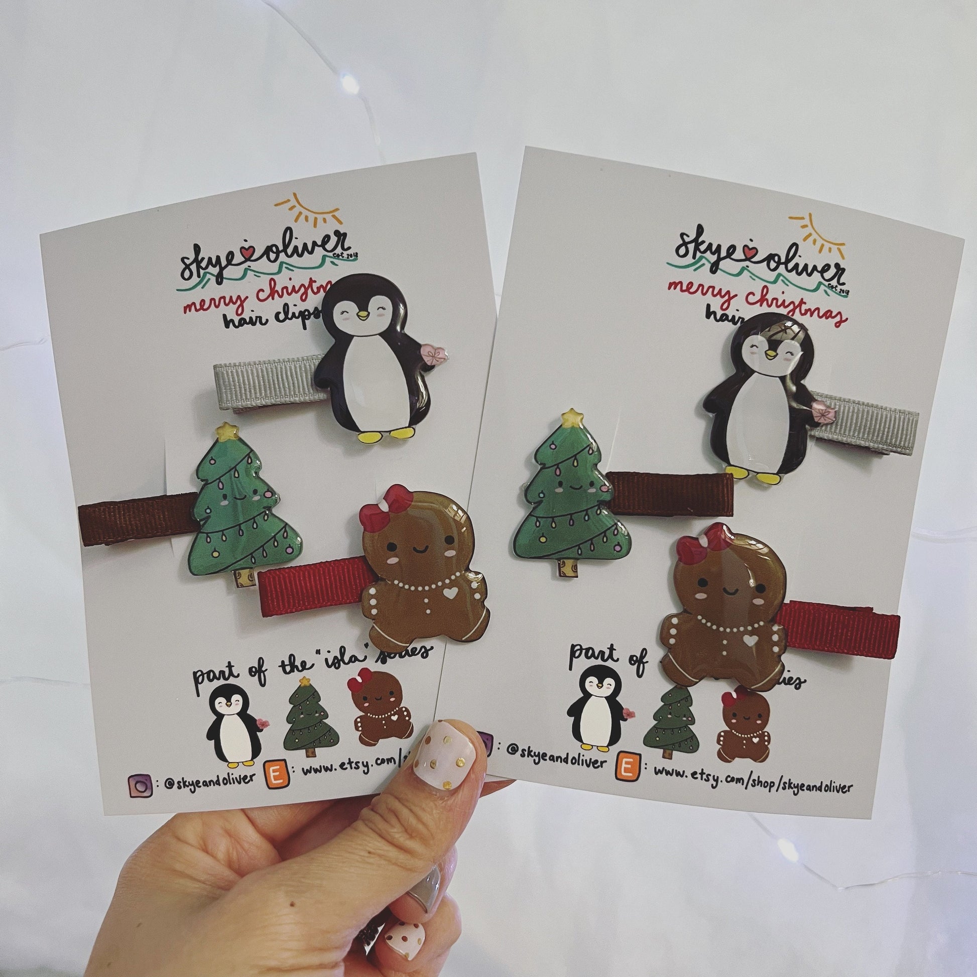 Holiday Edition hair clips: 3 clips in each set! You will need to tell me if you part to the LEFT or RIGHT side of your face. See picture for example.