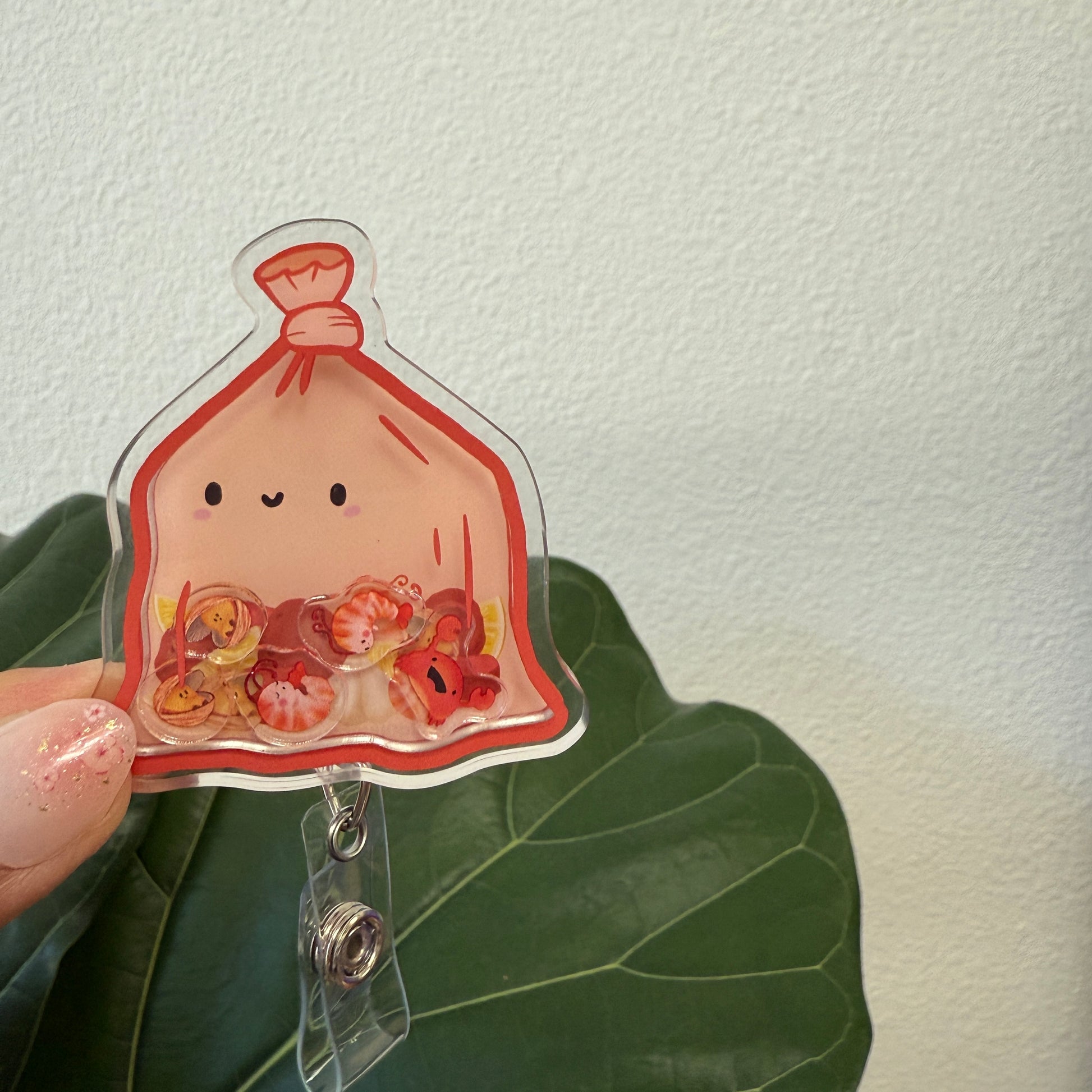 The cutest seafood boil that's TOO CUTE to eat π€ This design collab with @minimisa.co was so fun to make! This is a shaker badge reel with pieces of clam, crab, and shrimp! β¨ (Background with potatoes, sausage, lemon, garlic and corn).
