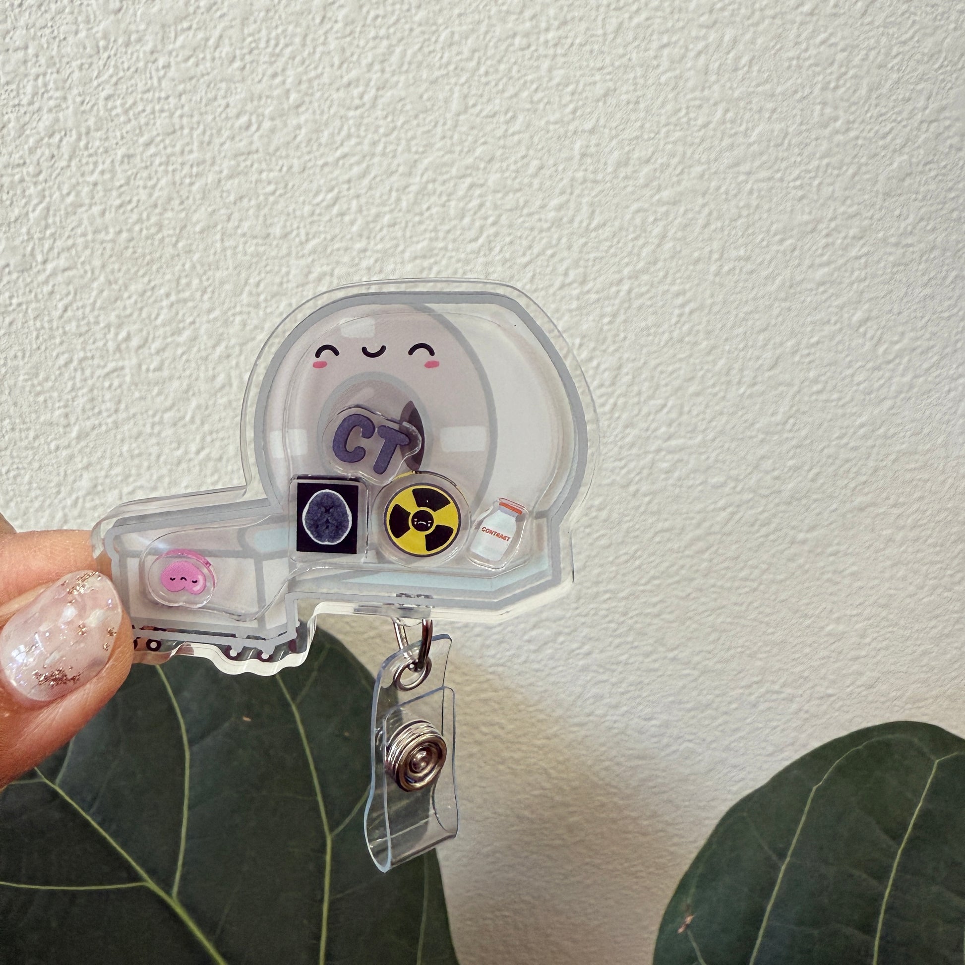 Shaker badge reel: CT charm, heart, radiation symbol brain CT, and contrast vial