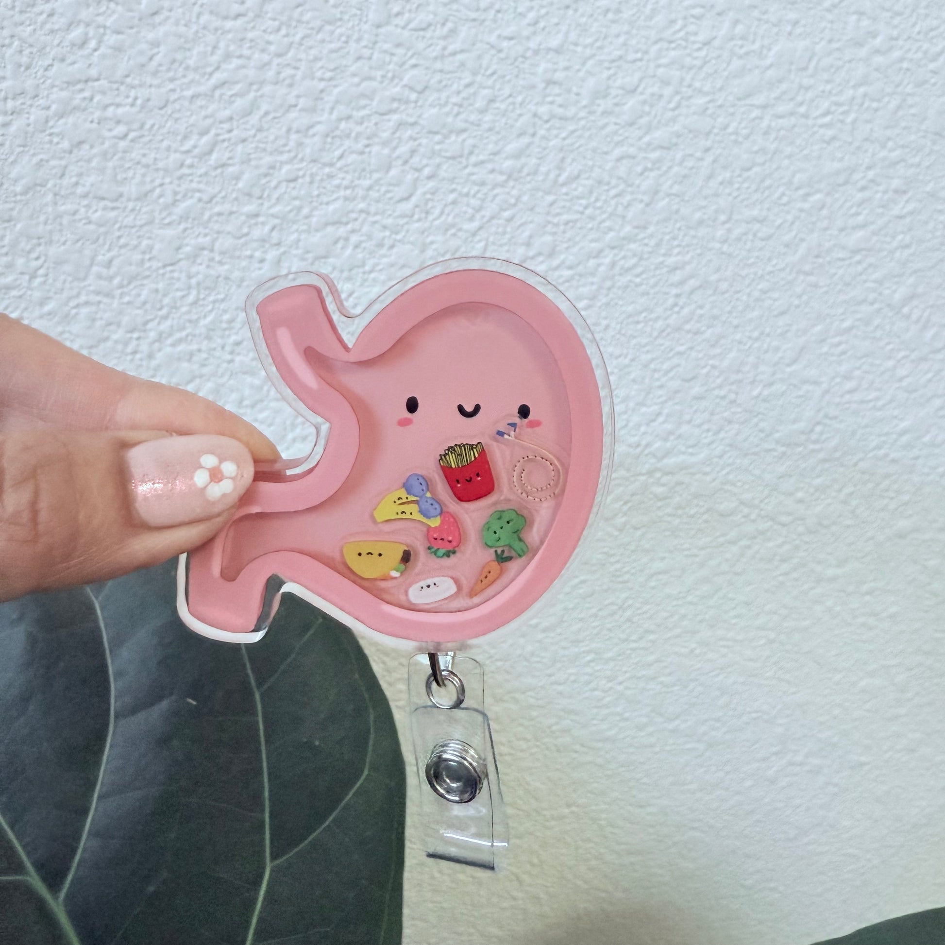 The cutest little stomach with pieces of fruit, vegetable, taco, fries, feeding tube, and antacid! 🙃 This is a liquid badge reel.
