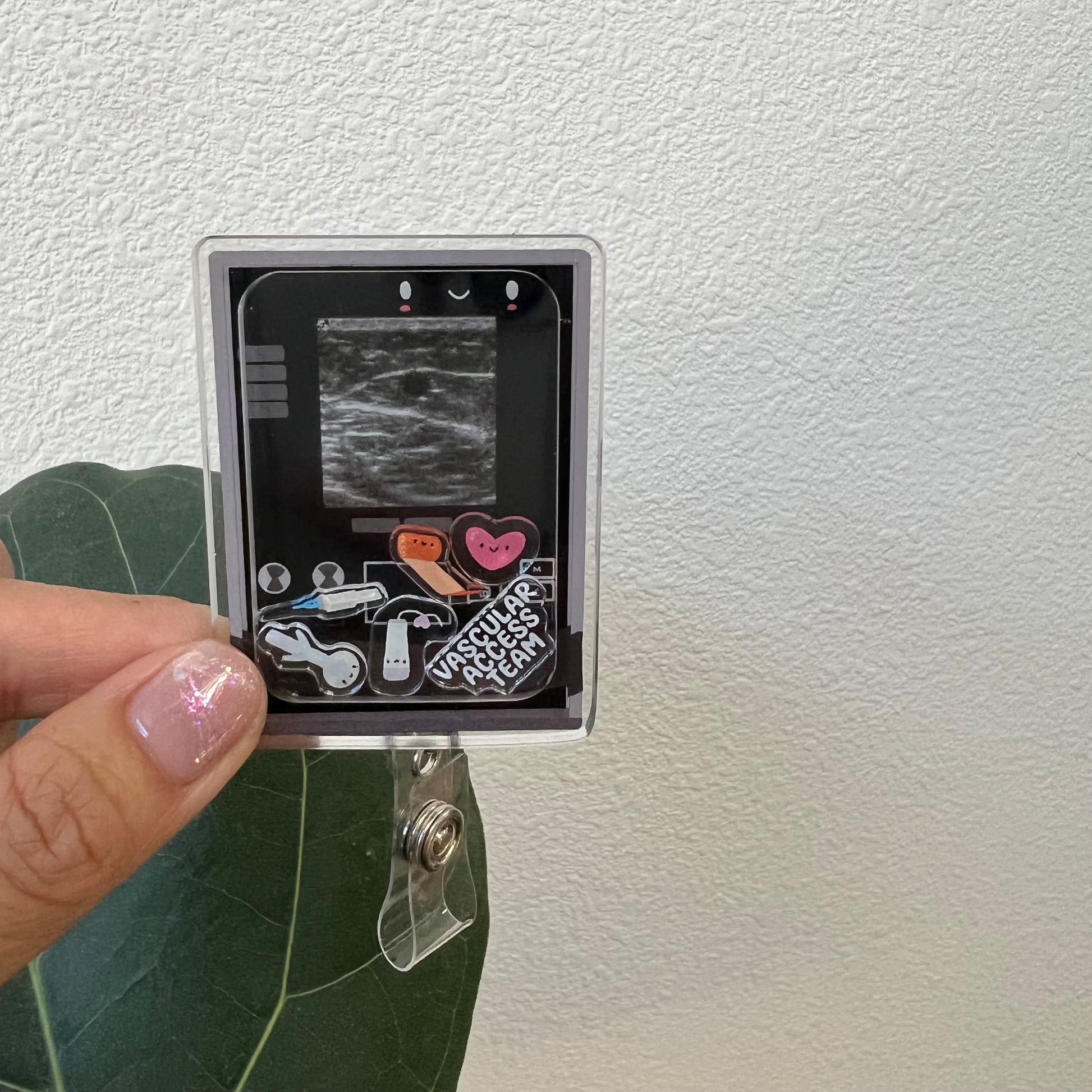 Ultrasound machine with pieces of tourniquet, skin prep solution, IV, ultrasound wand, heart, and vascular access team words shaking inside!