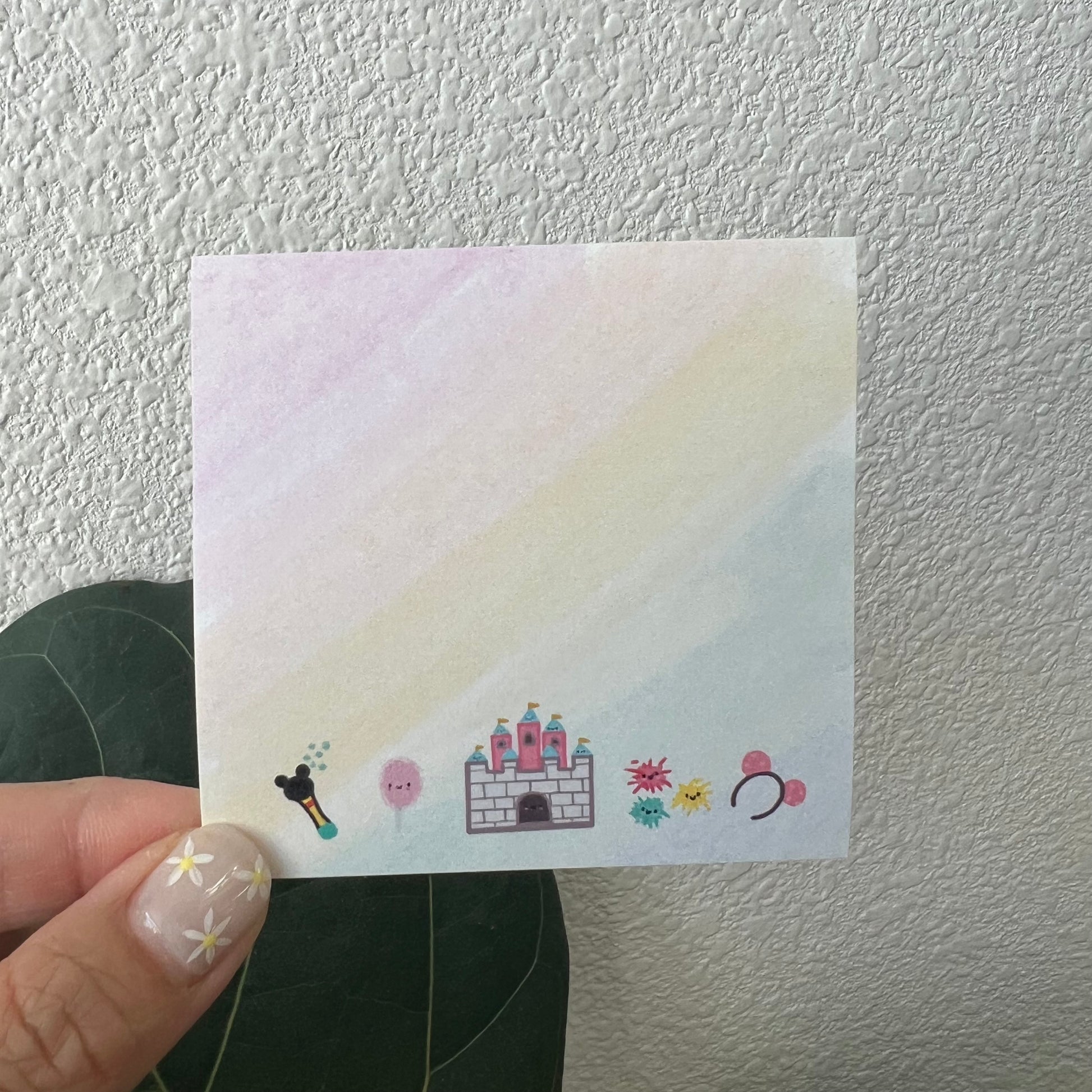 They are Post-it brand sticky notes and come with 50 sheets each. Measures 3"x3"