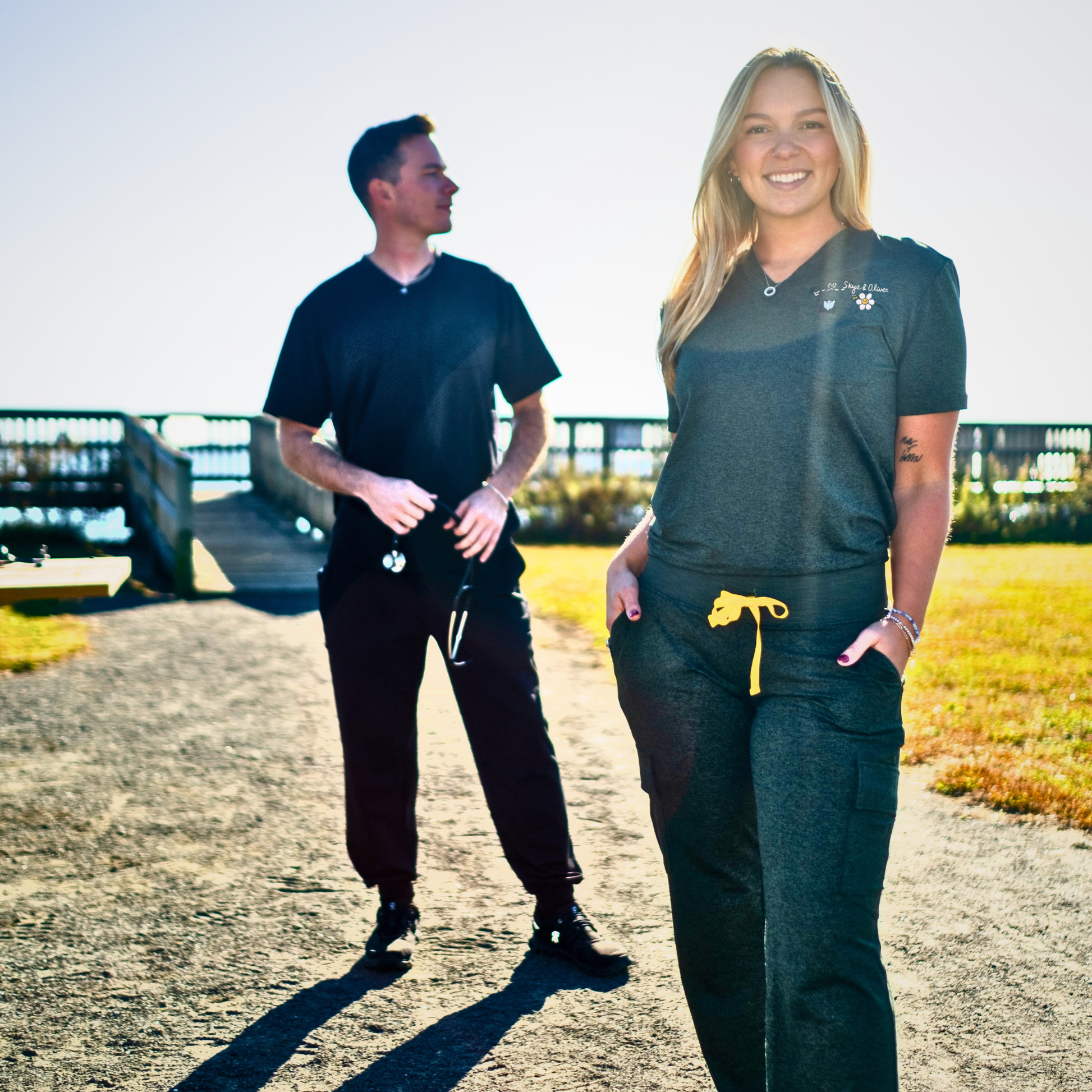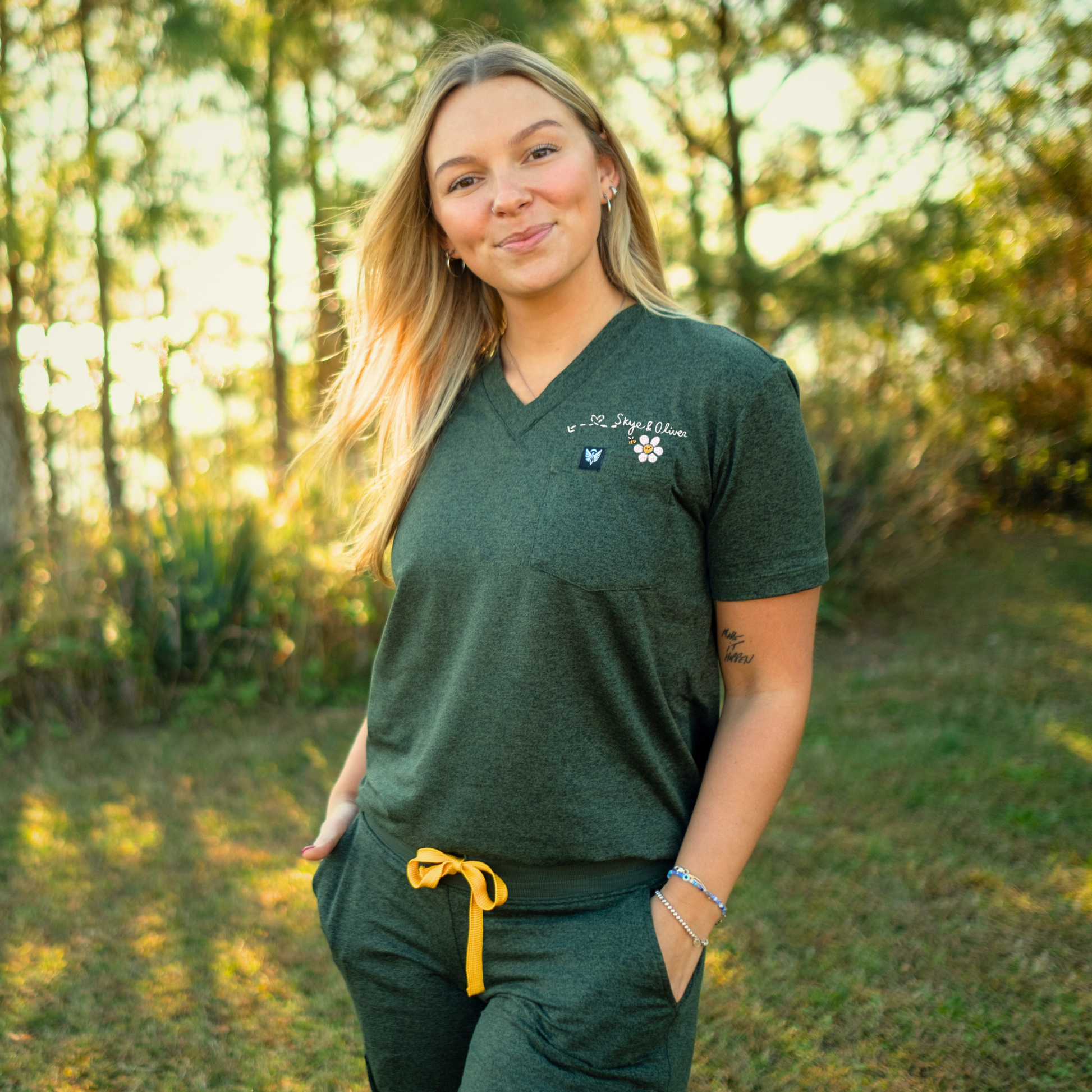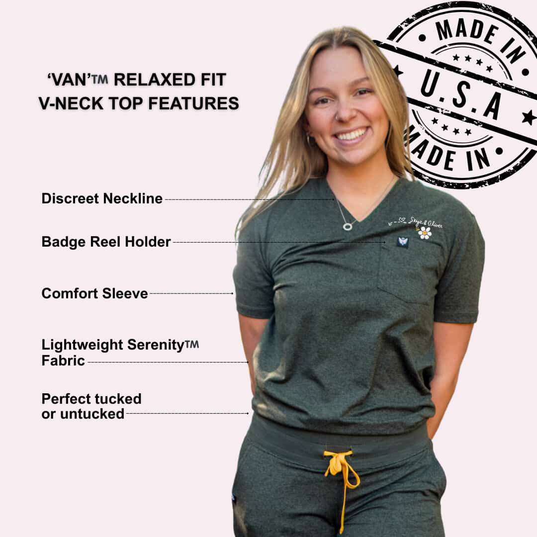 This top is so fun! I love the relaxed fit. My custom embroidery points right to the hidden no-sag badge reel holder, perfect for the new Daisy or other badge reel of your choice. And this shirt is literally softer than butter, I'm obsessed! A few fun facts about Soleya: